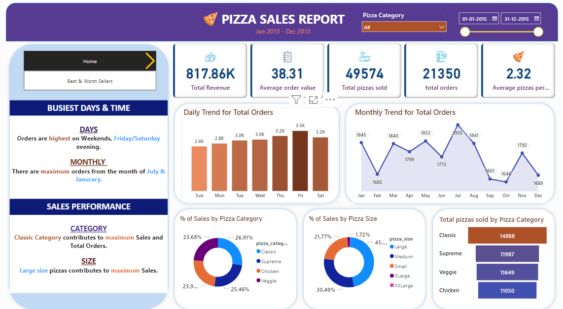 Designed and developed an interactive Power BI dashboard to analyze pizza sales data from January to December 2015. The dashboard provides deep insights into key performance metrics such as total revenue (817.86K), total orders, average order value, and pizzas sold. It identifies sales trends by day, month, category, and size—highlighting that Classic pizzas and Large sizes generate the highest revenue. The report also showcases best- and worst-performing pizzas by revenue, quantity, and total orders, enabling data-driven decision-making for inventory and marketing strategies.