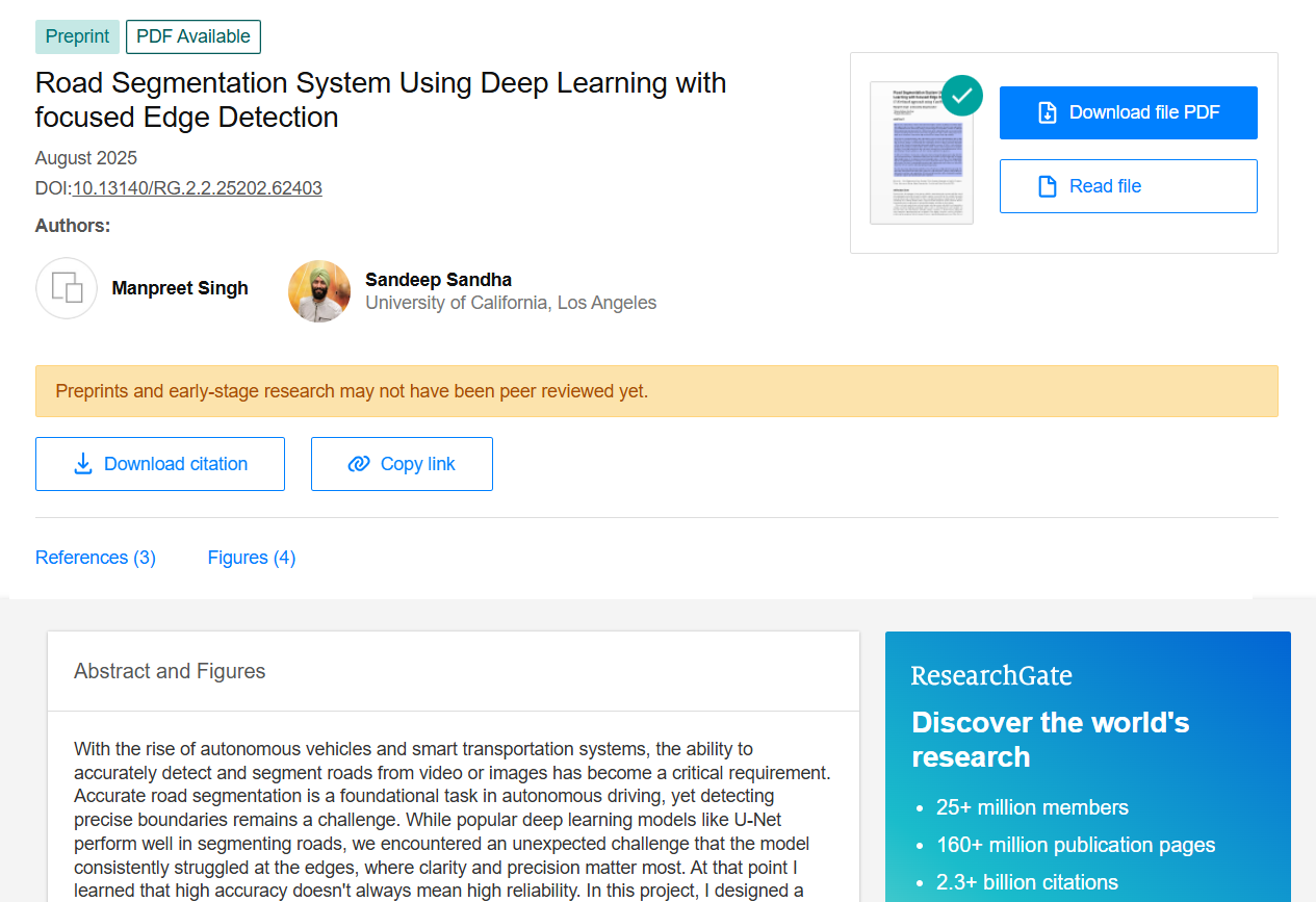 As an Intern at Punjab AI Excellence, I worked on developing an advanced road segmentation system using deep learning, with a special focus on sharpening edge detection for autonomous navigation. I built a U-Net based semantic segmentation model from scratch, created a preprocessing pipeline and converted multi-class masks into binary road masks. To tackle blurry boundaries in conventional models, I introduced an edge-weighted Binary Cross-Entropy loss using Canny edge detection, which boosted mean IoU from 87% to over 92% while maintaining ~97–98% accuracy. I validated the model on real-world road images, contributed to a research paper and strengthened my expertise in image segmentation, loss function customization and applied AI research, with future work aimed at real-time deployment.
